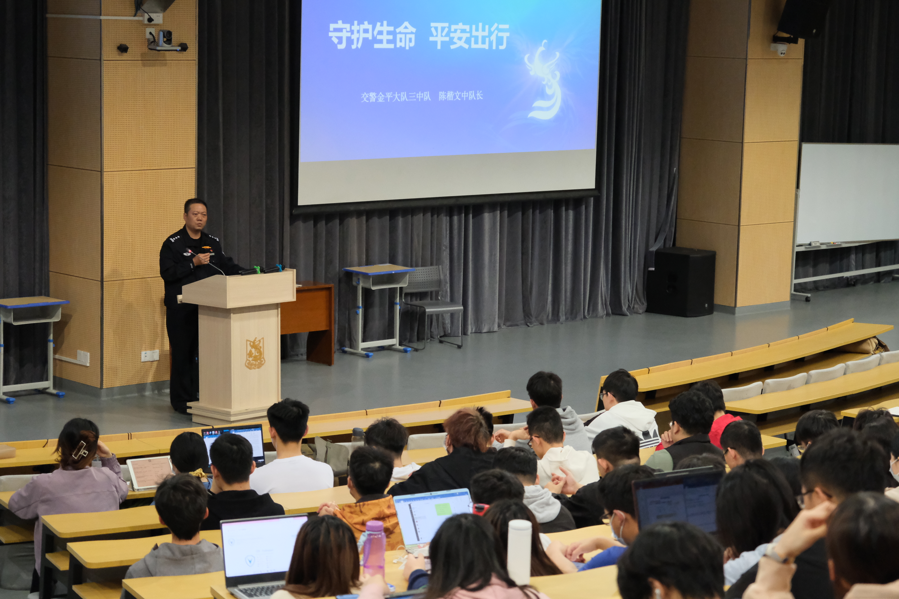 12月15日,学生处、保卫处在医学楼阶梯教室101举行了“守护生命,平安出行”校园交通安全宣讲会。约300同学参加此次活动,覆盖了大部分拥有摩托车、电动车的同学。 汕头市公安局交警金平支队陈楷文队长从一名从业多年的交通干警的视角,通过警示视频、交规讲解等形式给同学们上了一堂生动的交通安全课程。